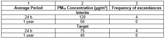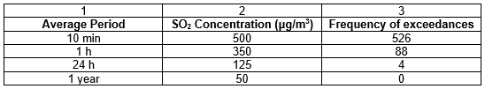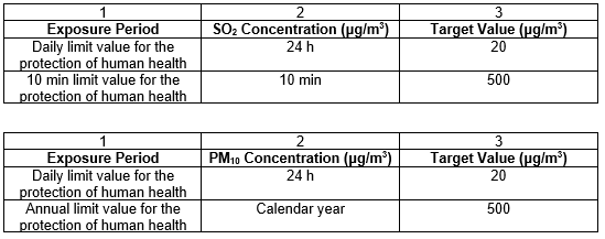 The SANS 1929:2011 detailed standards for exposure to SO2 and PM10, respectively and are summarised in the Tables below.