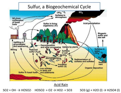 Sulphur dioxide (SO2) dissolves easily in water. Atmospheric sulphur dioxide (SO2), discharged on combustion of fossil fuels, can give rise to sulphuric acid in rainwater (acid-rain) and as such, this results in the return of sulphate to the environment.