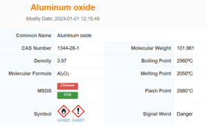 Aluminium oxide (Al2O3) – is a chemical compound of aluminium and oxygen. It is commonly referred to as Alumina. Aluminium oxide is responsible for the resistance of metallic aluminium to weathering. Aluminium oxide is insoluble in water.