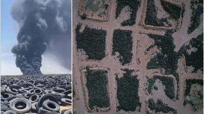 These tyre graveyards contain thousands of tonnes of rubber, which are exposed to the burning sun, thus releasing carcinogenic black carbon gas harmful to humans and the environment. Dioxins are released into the atmosphere when synthetic rubber combusts, even at low temperatures.
