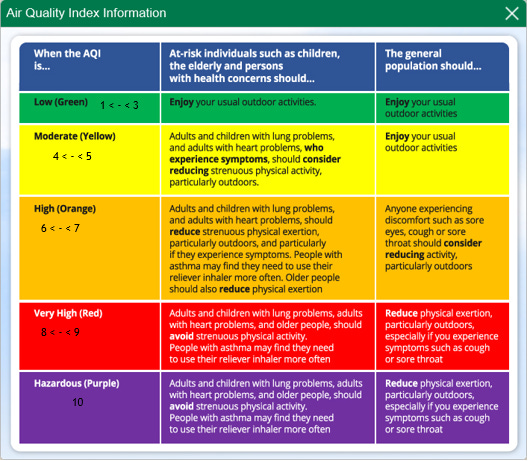 The South African Air Quality Information System (SAAQIS) provides a common platform where access to air quality information is available at stations across South Africa. Each station provides averaged hourly readings with optional viewing of weekly or monthly data. Though, only Sulphur Dioxide (SO2) and PM10 (particulate matter) are the components actively monitored as most of the stations only has available data for those 2 parameters. Below is the official legend and explanation of what the index used on the website means.